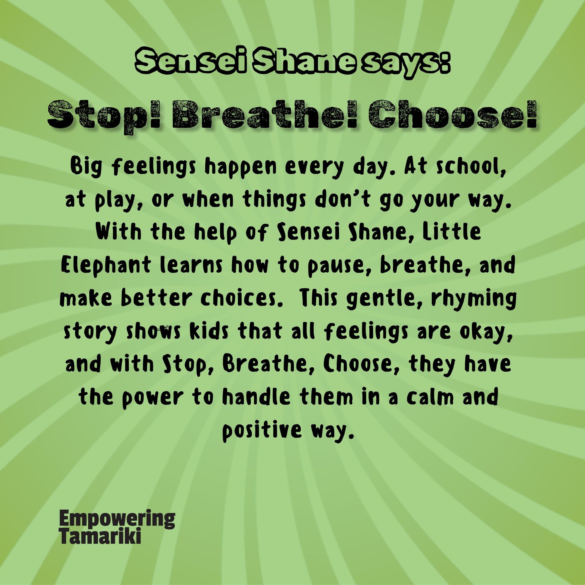 Sensei Shane Says: Stop! Breathe! Choose! is a calming, confidence-building rhyming story for children aged 5 to 8. When Little Elephant's big feelings start to take over, at school, during play, or in tricky moments, Sensei Shane is there to help. With gentle guidance, he teaches Little Elephant a powerful three-step strategy: Stop. Breathe. Choose.